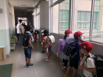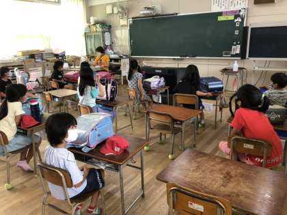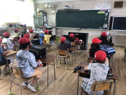 9月1日は防災の日です。大きな災害が起きた時に素早く集団下校ができるように、地区別に集まって集団下校の訓練をしました。1年生も初めてだしが素早い行動ができました。