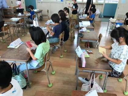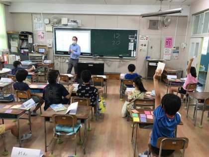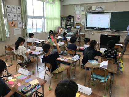 3年生の外国語活動です。色の名前を英語で学びます。ネィティブの先生がアクティビティにたくさん時間を使って、楽しく活動できました。