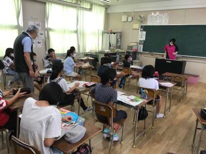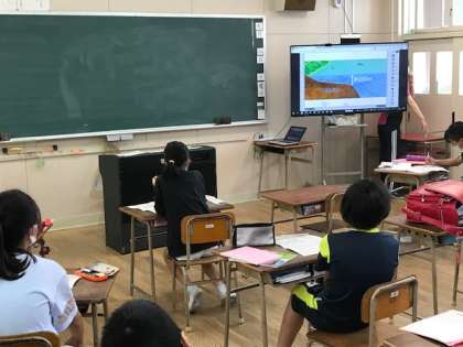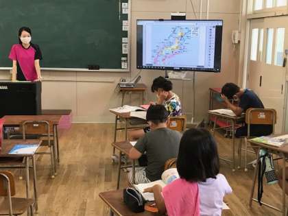 5年生が社会科のテストの答え合わせをしていました。海流の暖流と寒流、大陸棚、漁業についてなど、日本の自然と産業の関係を確認していました。