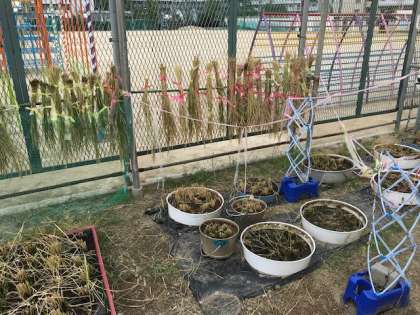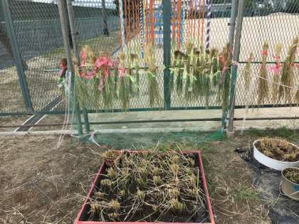 給食委員会がお米を刈り入れました。台風が近づく前に終了してよかったです。しばらく雨のかからないとこらに干します。