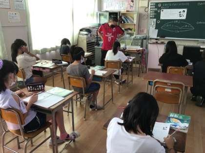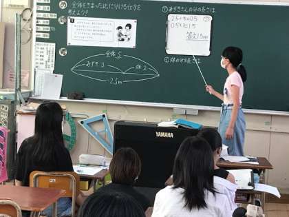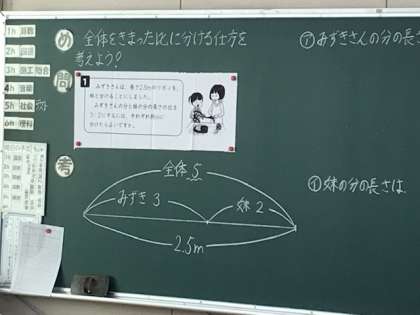 6年生の算数の時間、「比を使って」問題を解いていました。分数にしたり、小数にしたりしながら懸命に考えていました。黒板前で説明している子はとてもよく、わかりやすかったです。