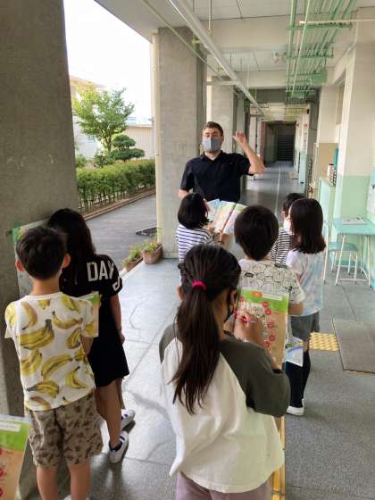 4年生が外国語活動の時間に職員室前で実際の教室と英語の発話を学んでいました。教科書だけでなく、実際の場所と英語をつなぐ学習です。