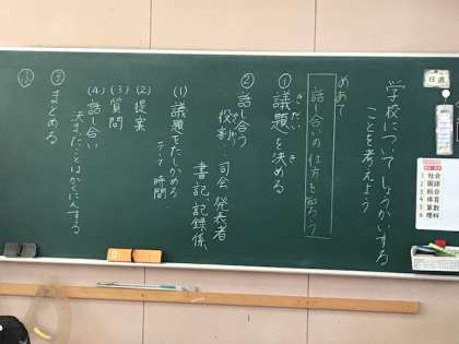4年生の国語科の時間に「学校について紹介しよう」という学習をしていました。議題を決めて、司会や発表者、記録などの役割を決めて話し合う方法を学習します。