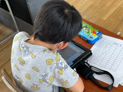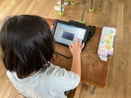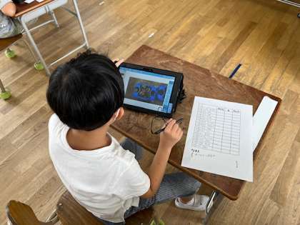 1年生が生活科の時間に、今までは撮りためたアサガオの写真に、記録をつけて整理していました。1人1人ちがう成長きろくが作れますね。