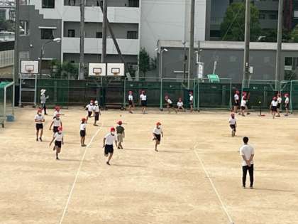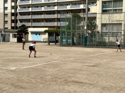 5年生がベースボール型の学習をしていました。チームごとに分かれて、キャッチボールやノック、ティーバッティングなどそれぞれに考えたメニューで練習していました。