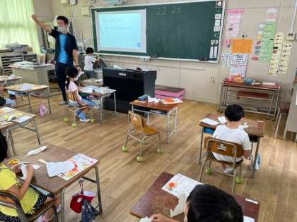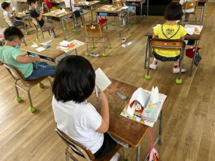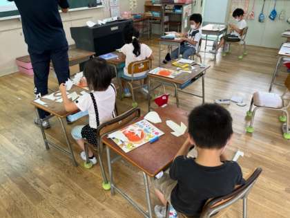 1年生が図工科の時間にチョキチョキハサミで紙を切っています。切れた紙はなんの形かな?切り取った紙を見て「うーん」と考えていました。想像力育ちますように。
