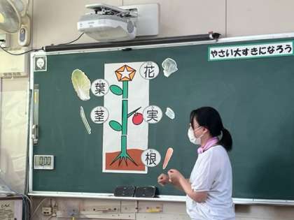 2年生が食育の学習をしていました。野菜のことをもっと知るための学習です。給食で食べている野菜は、実?茎?花?根?葉?どれでしょうか?子どもたちは野菜を思い浮かべながら考えていました。ブロッコリーは花だそうです。