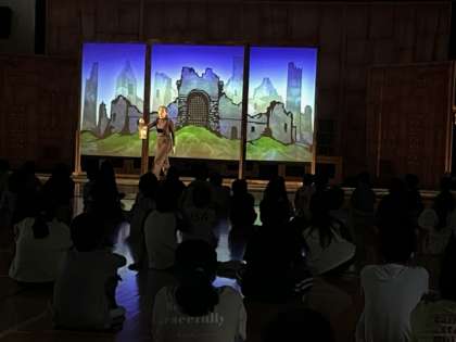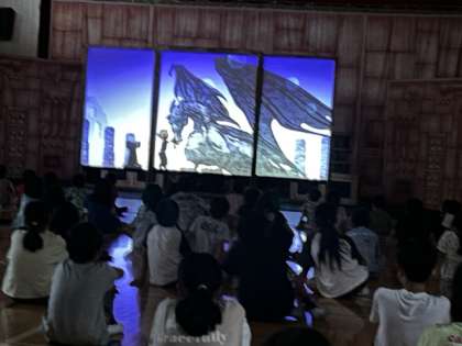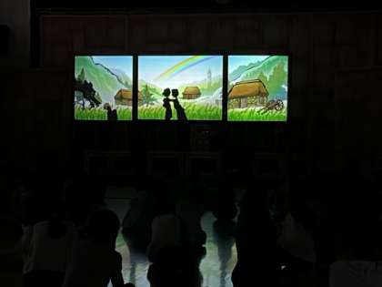 影絵劇は、影絵と人間が登場してきました。お話の中に吸い込まれていきます。子どもたちも前のめりで鑑賞しています。