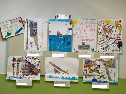 1年生の作品です。広告用紙などをちぎり、できた形から想像を膨らませて作りました。見え方は個性ですね。素敵な作品です。