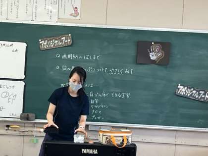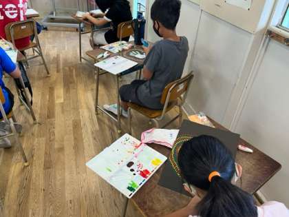 5年生の図工科の時間に「アボリジナルアート」と言う作品を作っていました。一色ずつとても丁寧に色をつけていました。集中力の必要な作品ですね。