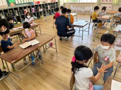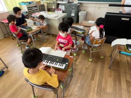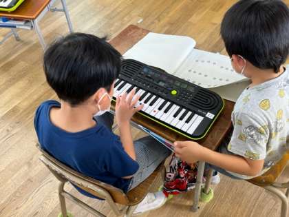1年生の音楽の時間です。初めは、「おちゃらかほい」をしていました。勝っても負けても楽しそうです。その後、ミニ電子オルガンの練習です。楽譜をめくる人は、音符を指で押さえる、ドラミを読むなどの工夫をしていました。