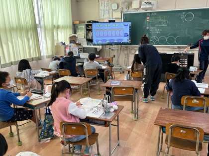 3年生が算数科の時間にコンパスを使って複雑な模様を描いていました。コンパスの針を置く円の中心を見つけて描いていました。