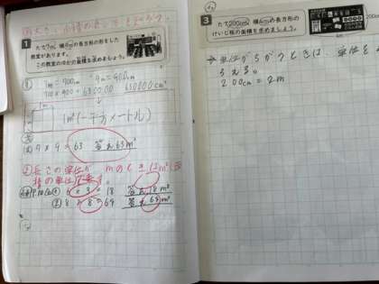 4年生は、長方形の面積を求めていました。縦と横の単位がちがうとどう考えるのか。学んだ内容を活用することが大切ですね。