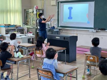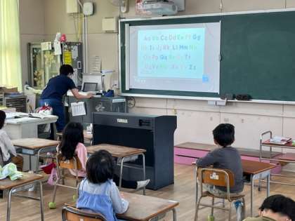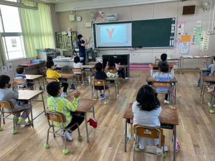1年生が朝の時間の英語学習をしていました。ABCの歌を歌いながら、決められた色の時に拍手をします。上手にできていました。手がかゆいそうですけど。