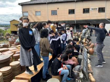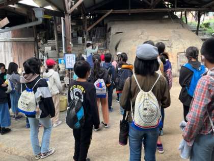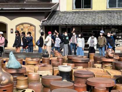 見学後にはたくさんの陶器がある場所で記念撮影です。わくわくしていますね。