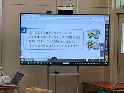 5年生は算数科で「単位量当たりの量」を求める学習をしていました。実生活にも直接結びつく内容や、物理なら繋がる考え方でもあります。