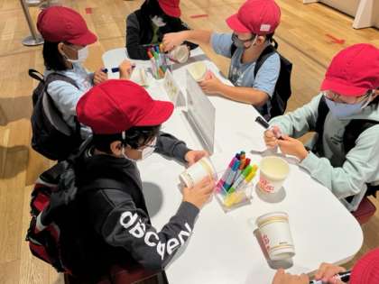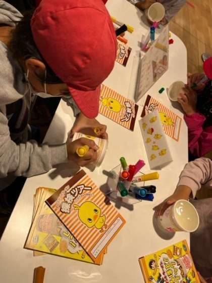 空のカップをもらって好きなデザインを描きます。ひよこちゃんが多いみたいですね。