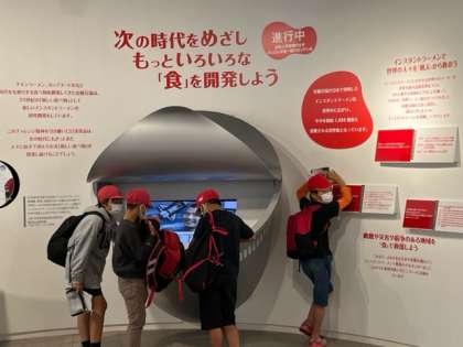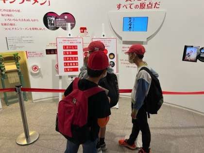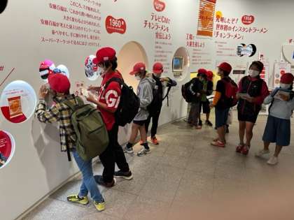 館内の見学時には、持ってきたしおりにインスタントラーメンを歴史や開発の秘話、宇宙ラーメンなどを調べてメモしていました。