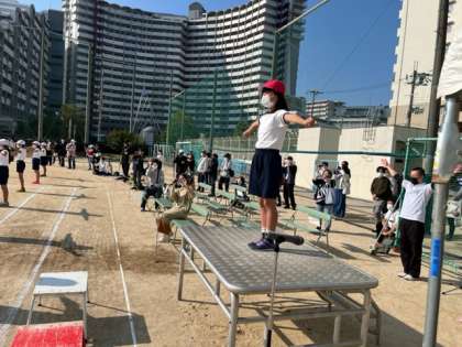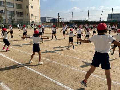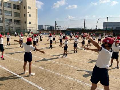 運動委員会のみんなが前でラジオ体操をしてくれます。みんなとても上手にラジオ体操ができていました。