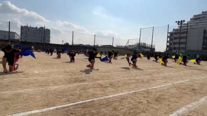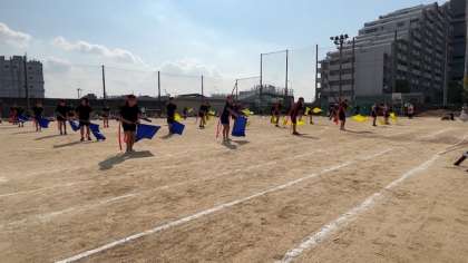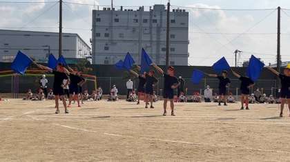 5.6年生による団体演技「空と海を駆ける」のフラッグの演技です。力強いフラッグの風を切る音が会場に響きます。