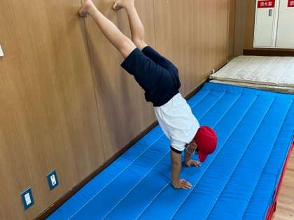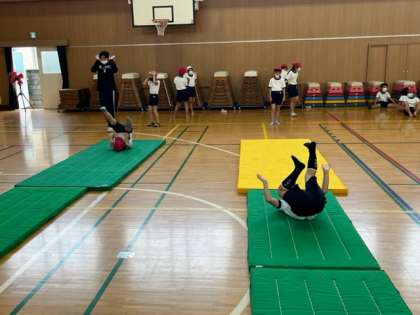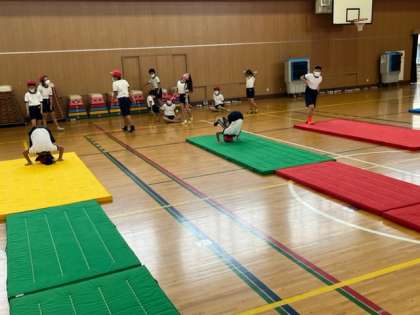 3年生の体育科は「マット運動」です。前転後転、倒立とさまざまな回転運動や支持の運動に挑戦していました。