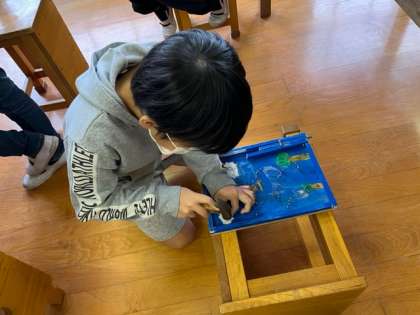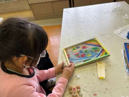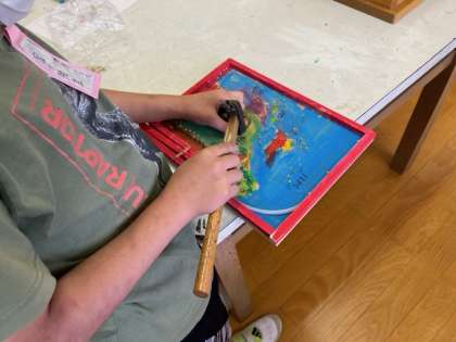 3年生の図工科の時間です。「コリントゲーム」のくぎ打ちを頑張っていました。トントントントン。早くできた人は試しに遊んでいました。