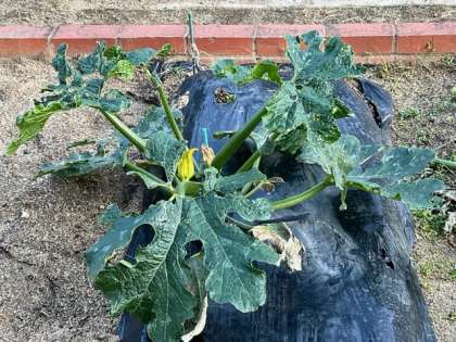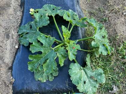 学習園で大きな葉をつけていました。これは、ズッキーニだそうです。花も咲いていたのでもうすぐ実がなるのでしょうか。