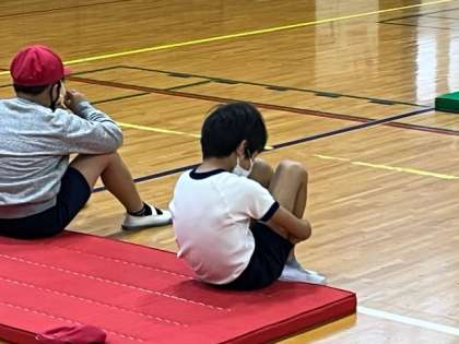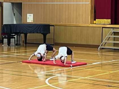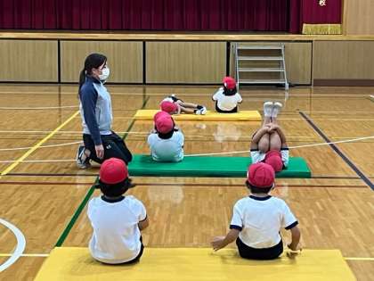 2年生が体育科の時間に「マットを使った運動遊び」をしていました。だるま転がりやブリッジなど感覚作りの遊びで体をほぐしました。