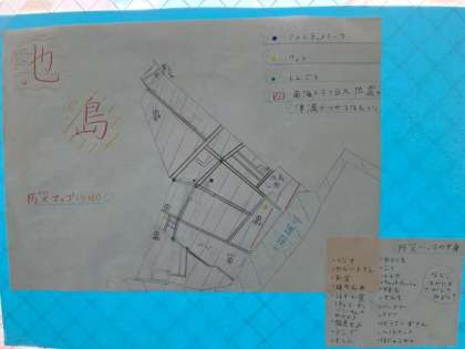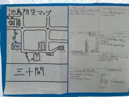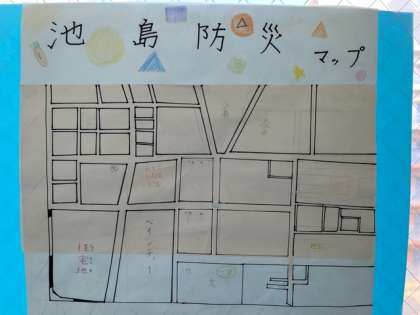 4年生制作の防災マップです。PCを使って池島の地域を調べて作りました。防災への意識が高まりますね。