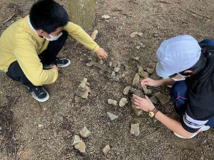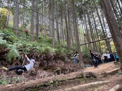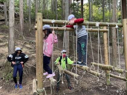 山中のアスレチックでもたくさん遊べました。普段体験できないことばかりです。石積みも楽しいようです。