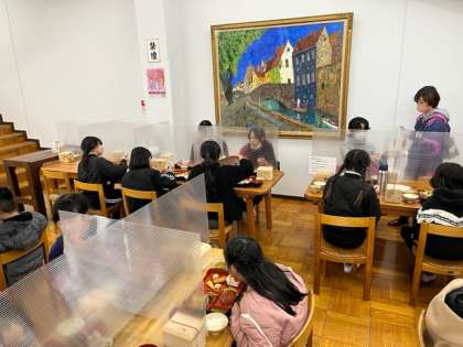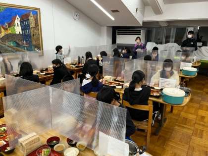 食事の場所は全て区切られていて感染対策がとても行き届いています。子どもたちは話をせず食べています。