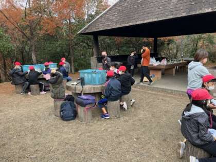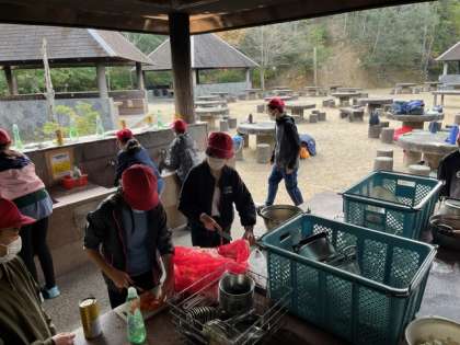 今日のメインの活動「飯盒炊爨」です。まずは食器や鍋、まな板を取りに行き、洗ってから野菜を切ります。