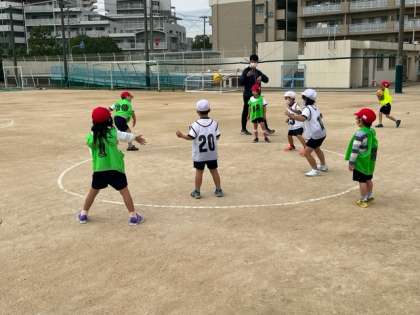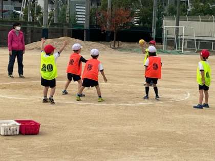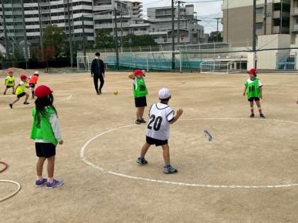 投げる人は相手の動きをよく見て投げないと当たりません。ボールが遠くに行かないように守ることも大切です。1年生の子はたくさんいい動きができていました。