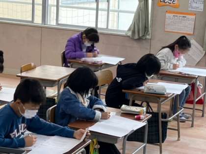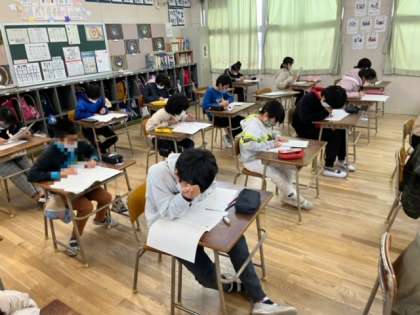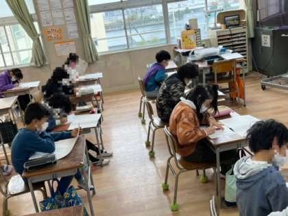 今日は大阪市学力経年調査の1日目です。2時間目に国語、3時間目に社会のテストを受けます。みんな真剣に向かい合っています。3年生は初めてテストです。