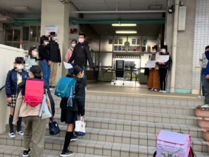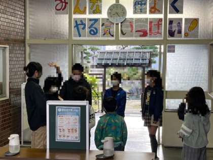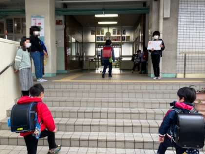 今日は2班が当番です。初めは小さな声もだんだん大きくなり、正門前を通る大人の方にもあいさつしていました。反省会でも「大きな声を出せた。」「みんなに声を出してもらえてよかった。」などの意見が出ていました。