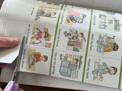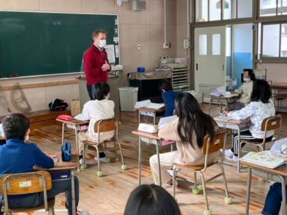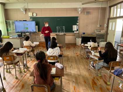 4年生は英語活動の時間です。おうちでの過ごし方を英語で学びます。「do my homework」「go to bed」カードも使って発話します。
