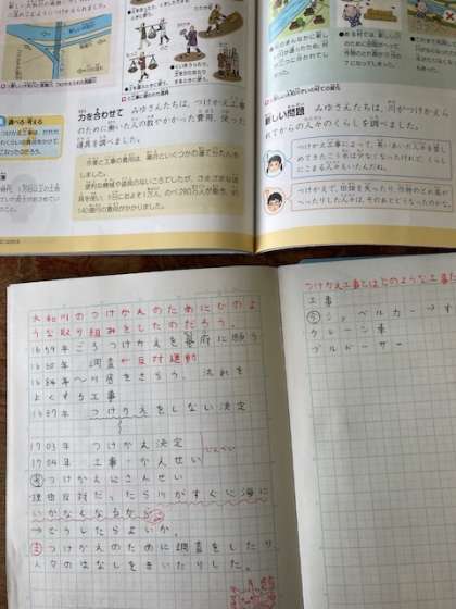 大和川のつけかえ工事の苦労を、体も動かしながらみんなで考えています。ノートもこんなにしっかりとれるようになっていてすごいです。