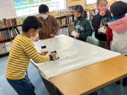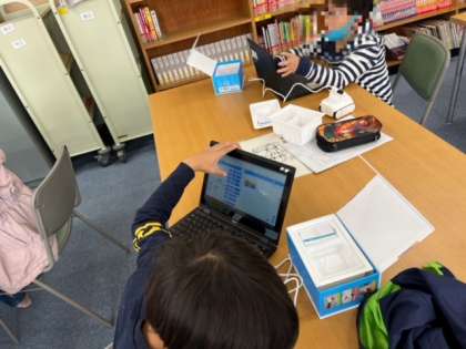3年生のプログラミング学習です。学習者用端末を使い、1人1台ずつロボットカーを動かします。思い通りに動かせるかどうか相談しながら進めていました。