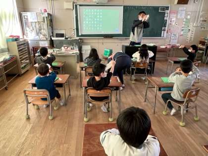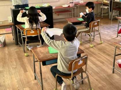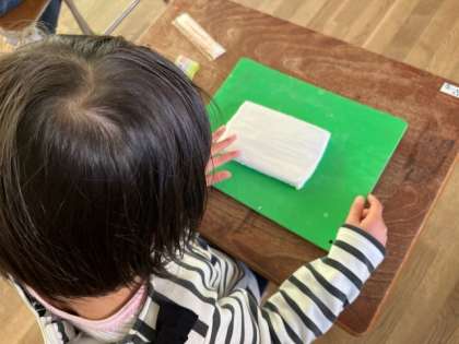 1年生の図工の時間です。紙粘土をコネコネしていました。ビヨーンと伸ばしてお団子作って、これから何ができるのかしら?
