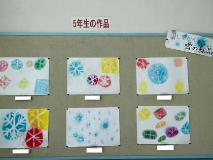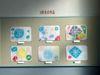 5年生の作品です。色鮮やかな雪の結晶です。さわるととけてしまうのではないかというはかなさを感じます。