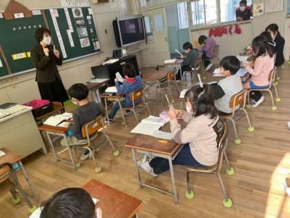2年生国語科の研究授業です。「あなのやくわり」という説明的文章の学習です。子どもたちは、文章全体の構成について考えています。