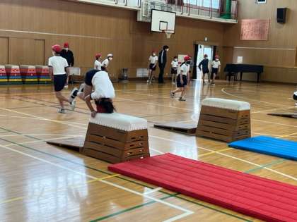 5年生が体育館で跳び箱の学習をしていました。台上前転で腰が上がり大きく回転できています。