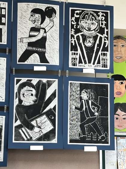6年生の版画の作品です。思い出の1シーンを切り取っています。人物の動きや表情がとてもいいですね。
