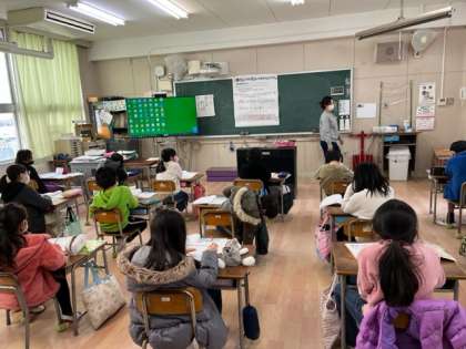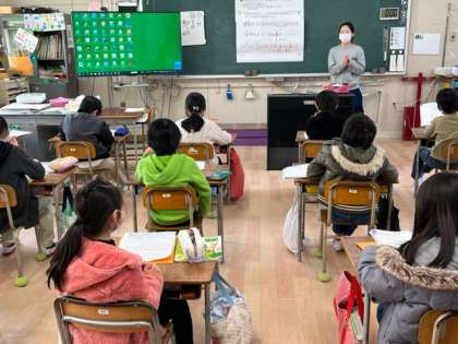 3年生は「あの雲のように」というきれいな旋律の曲を学習していました。初めてタイ(音を長く伸ばす)を知りました。大きな声で歌えませんが、きれいな声で歌っていました。