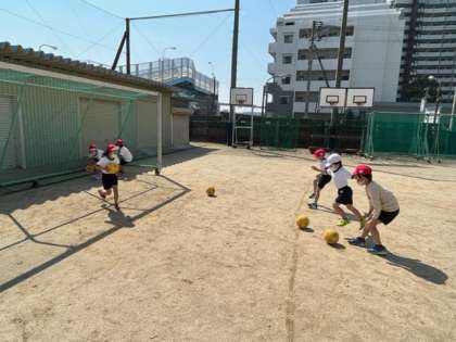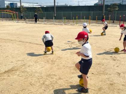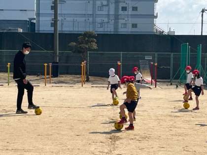 1年生のボールけりのゲームです。キャプテン翼世代の先生が「ボールは友だちだよ。」と言うと、1年生の子どもから「ボールは味方。」という発言がありました。いいですね。