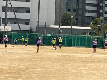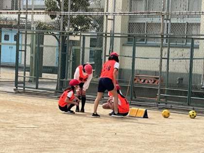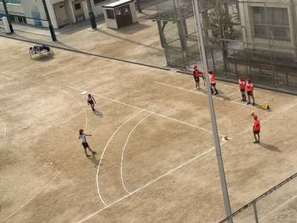 6年生がベースボール型の学習で、キックベースボールをしていました。蹴る方向や強さを考えて攻撃です。守備は蹴る人に合わせて守っていました。