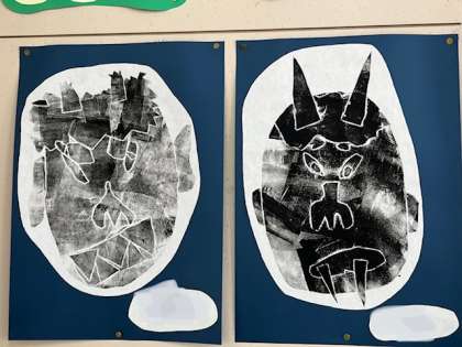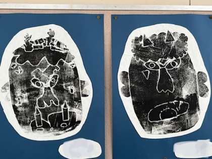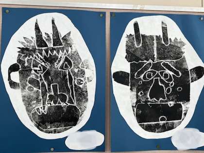 > 1年生が作った紙版画の作品です。画面いっぱいにとても大きく作れました。
