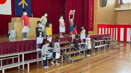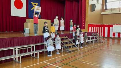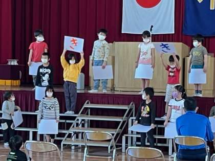1年生が入学式のお迎えの式のために練習をしていました。教室と違って講堂では、今までより大きな声を出さないといけません。子どもたちは、一生懸命声を出していました。とても上手です。感動しました。