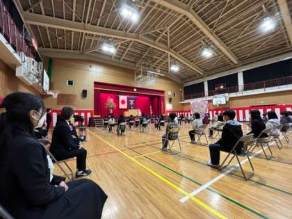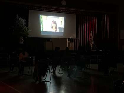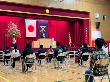 校長先生の式辞、PTA会長様の祝辞の後、末永幸歩先生からオンラインでお祝いの言葉をいただきました。サプライズ登場に子どもたちも喜んでいました。