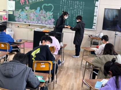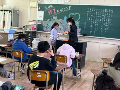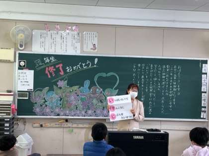 教室に帰ってから先生のお話を聞いて、通知票と健康の記録をいただきました。担任の先生からの一言に真剣にうなずいていました。